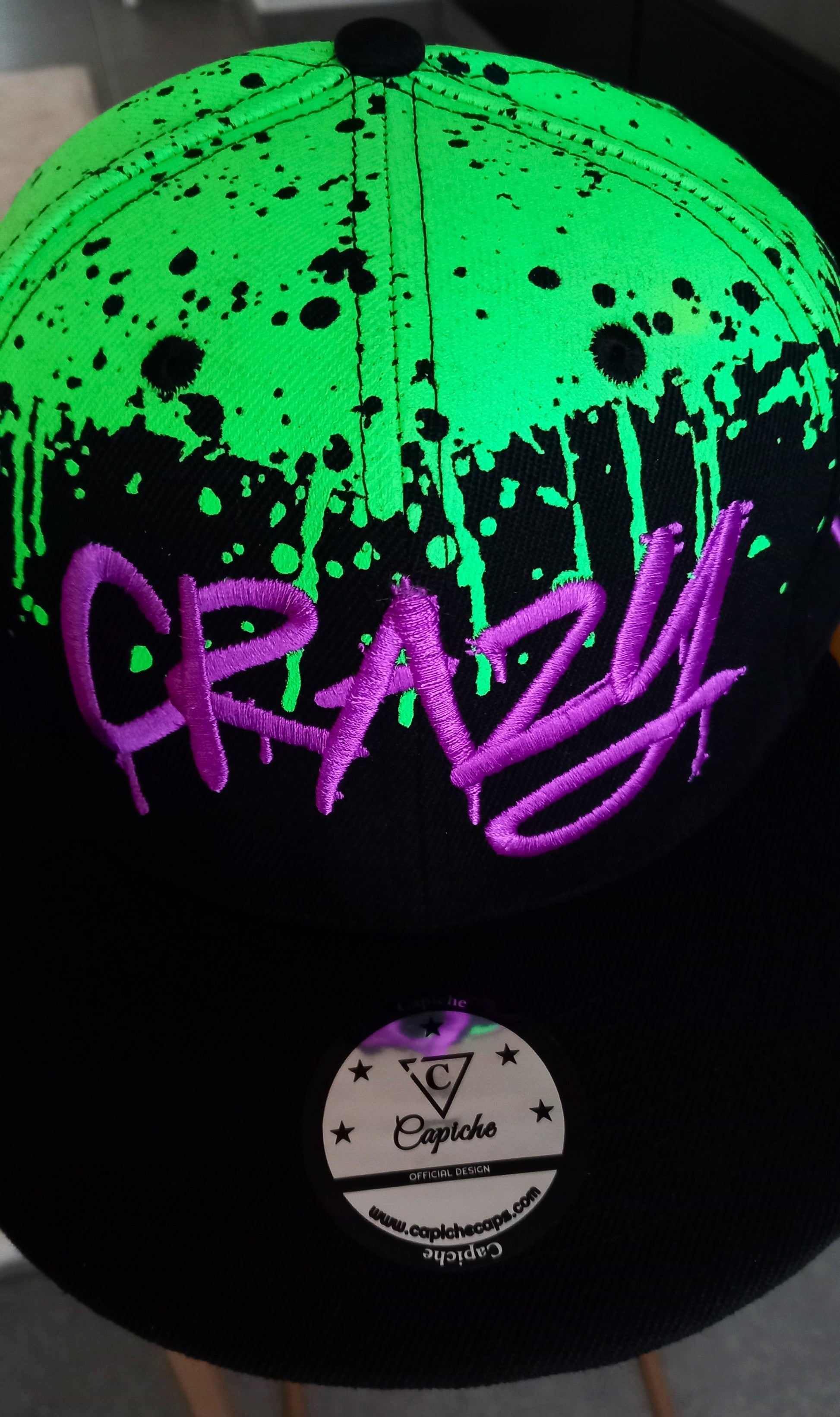 Freestyler is a part of the newest Graffiti Collection. Freestyler stands out because of the awesome neon green spray paint effect on top of the hat! It’s a real eyecatcher in your cap collection. The front logo is the word ‘’CRAZY’’ in purple. The left side of the snapback is embroidered with the traditional ‘C’ logo of Capiche and the back side is embroidered with ‘Capiche’. The embroideries are purple. The bottom design is a special Capiche freestyle design, made by a professional graffiti artist.