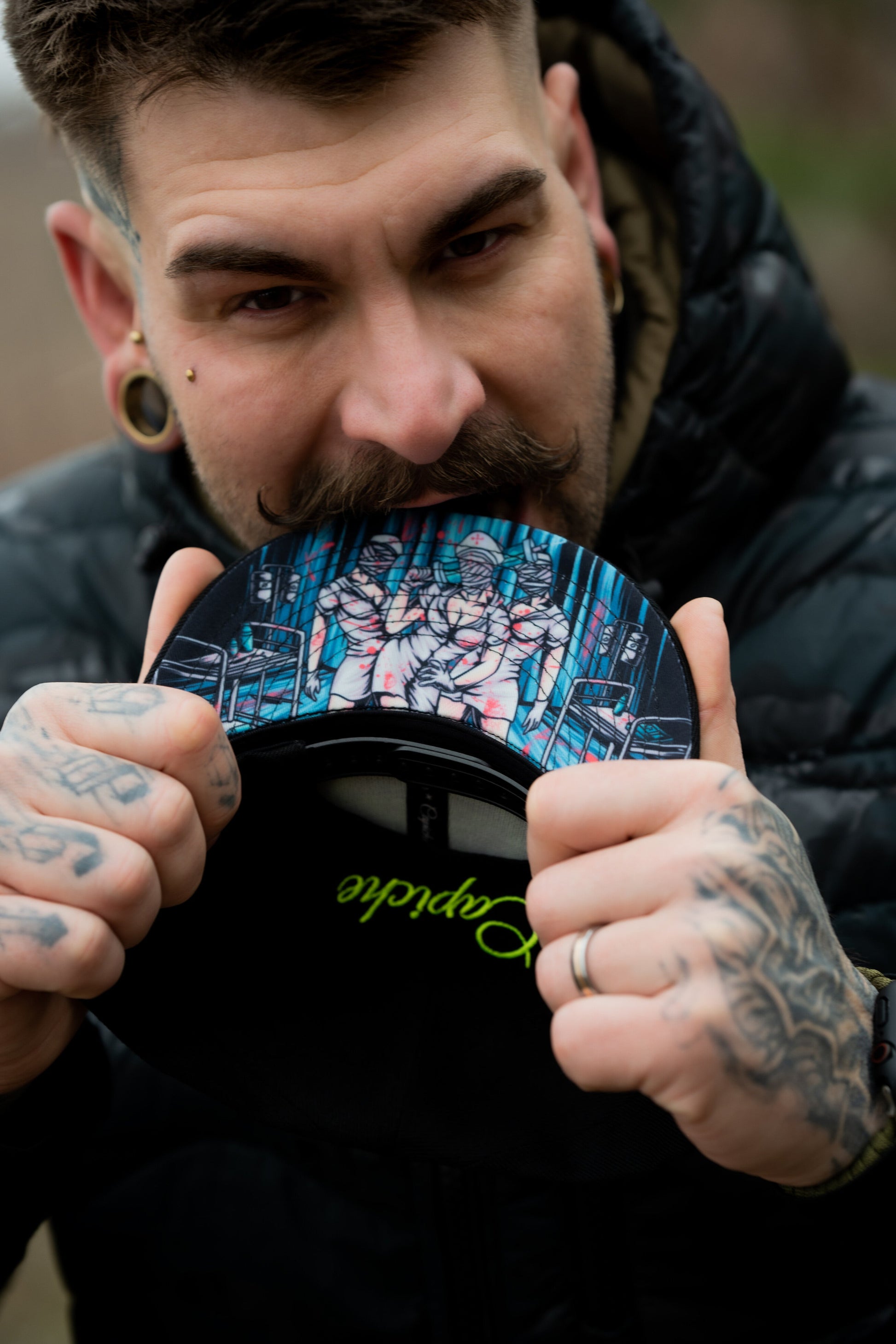 Cursed Nurse is a black snapback with a black brim. The front logo is neon green pentagram. The left side of the snapback is embroidered with the traditional logo of Capiche and the back side is embroidered with Capiche. The embroideries are neon green. The brim bottom is covered with the cursed nurse design.