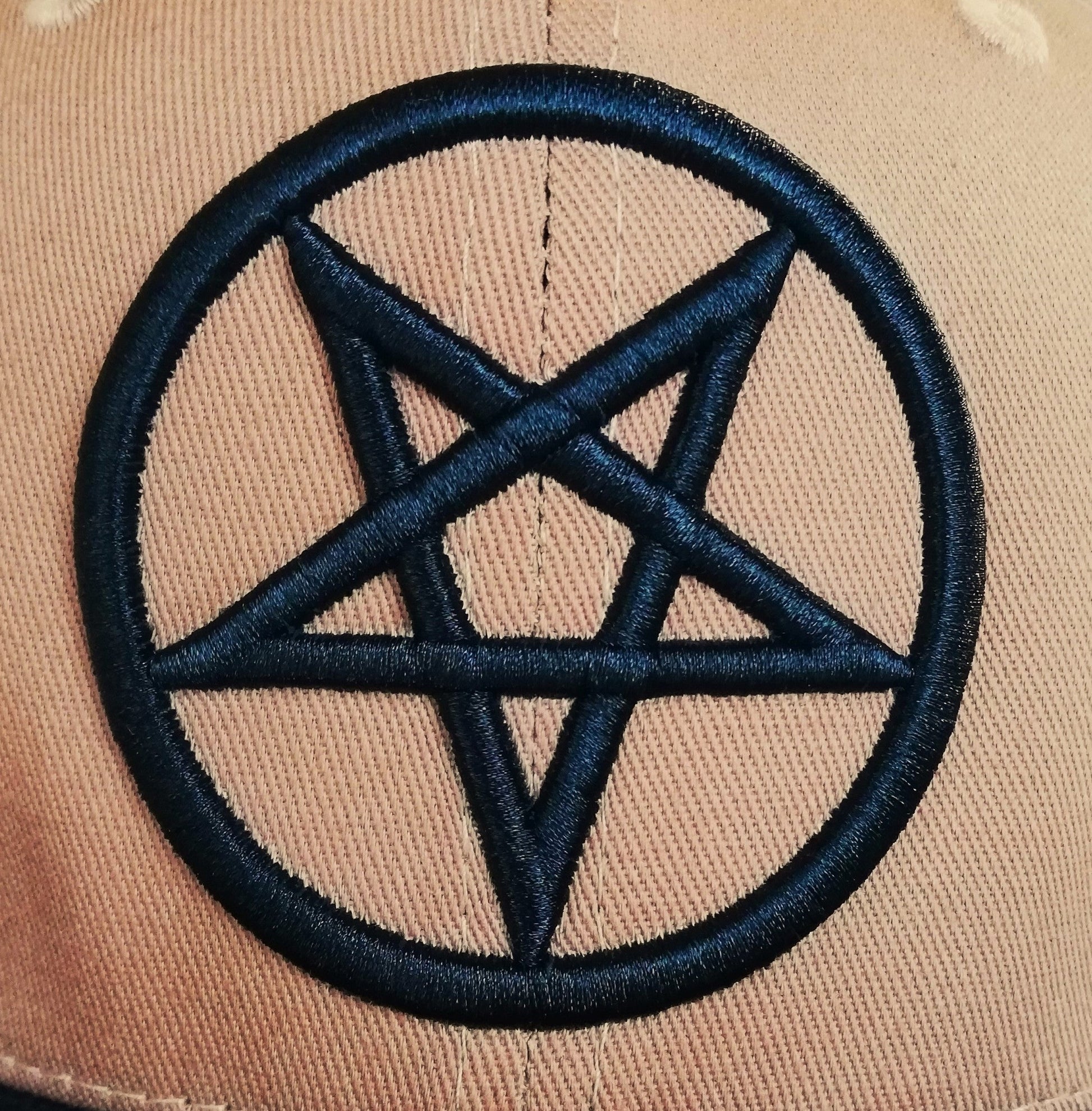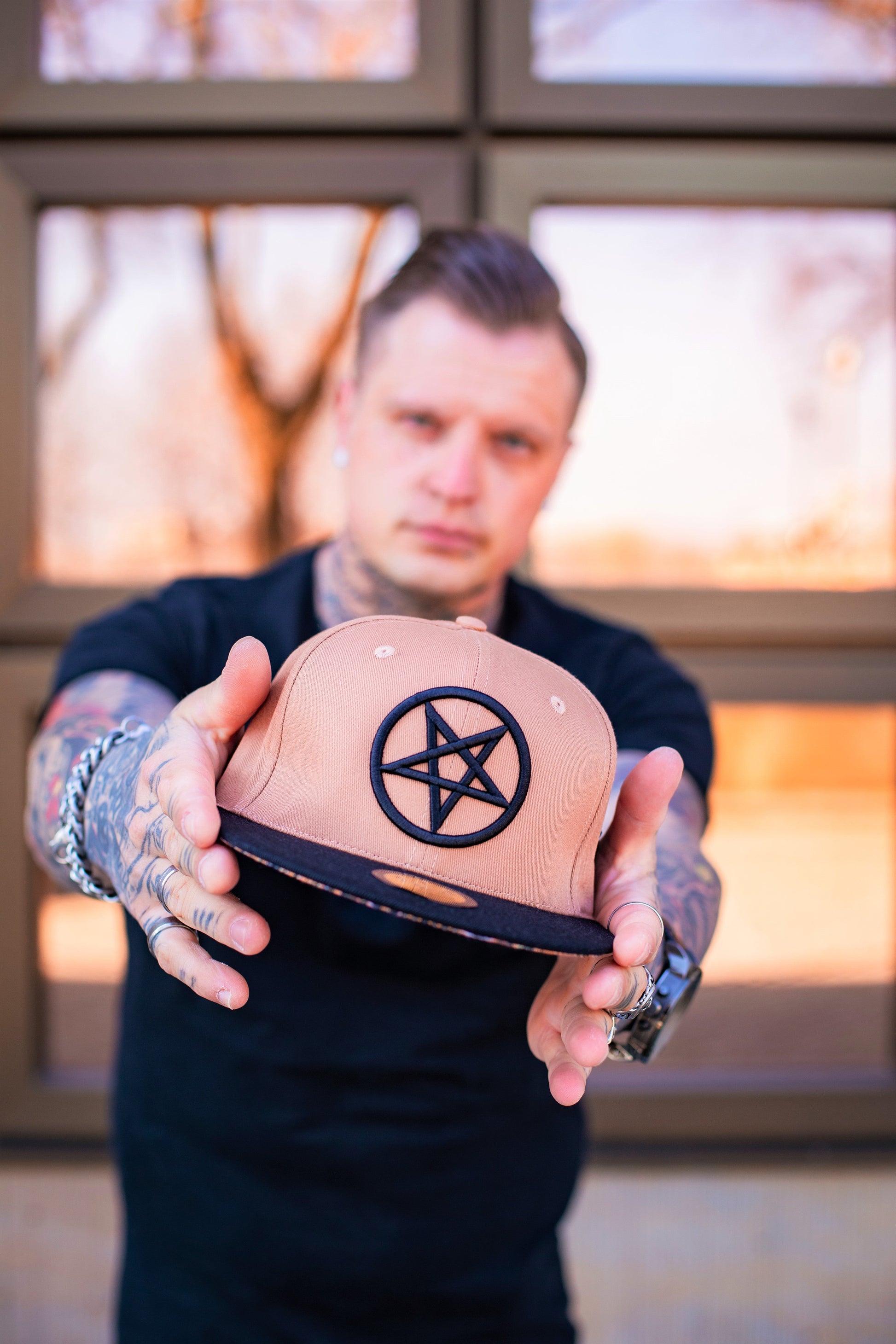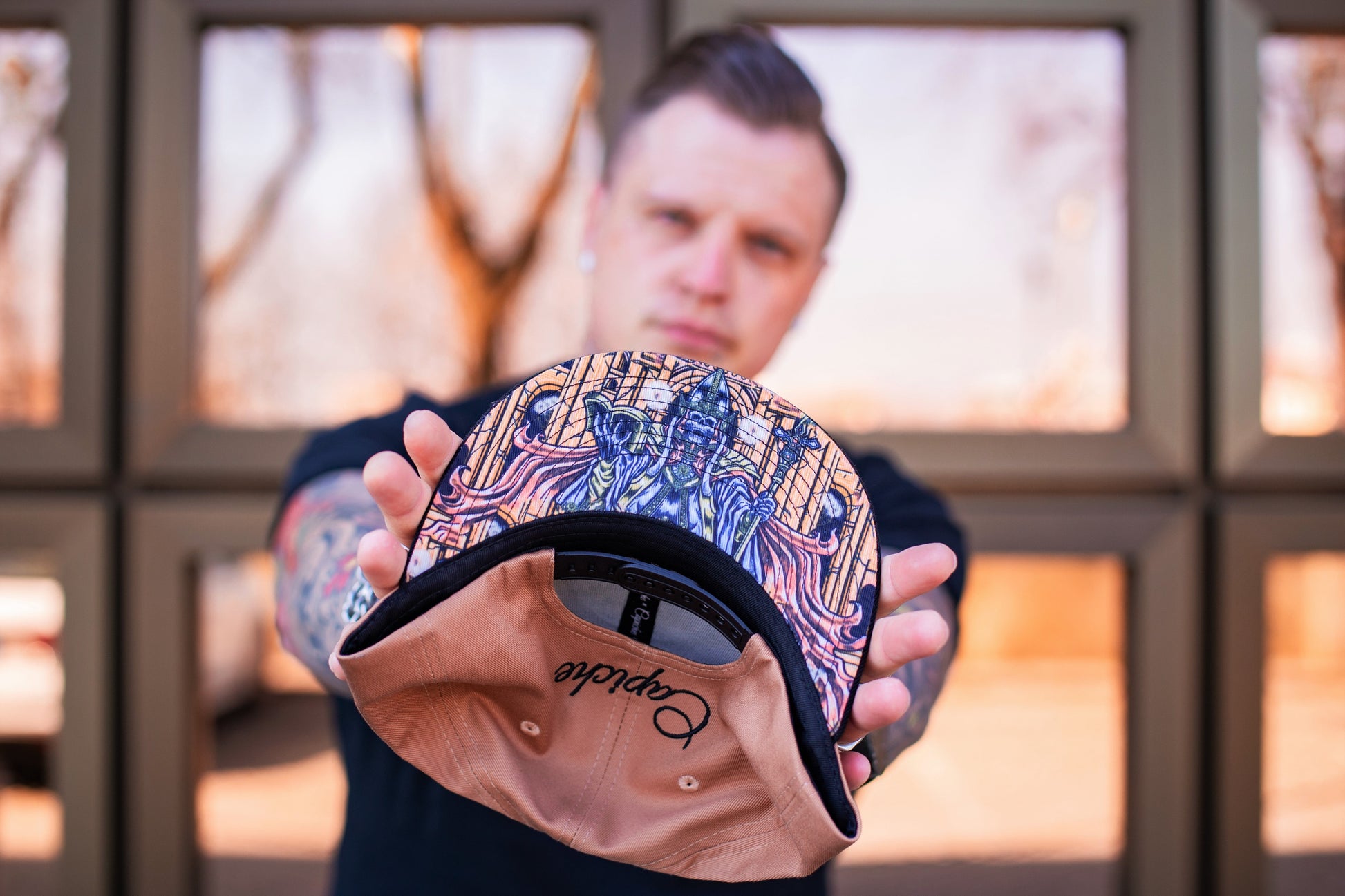 Cursed Priest is a light brown snapback with a black brim. The front logo is a black pentagram. The left side of the snapback is embroidered with the traditional logo of Capiche and the back side is embroidered with “Capiche”. The embroideries are in black. The brim bottom is covered with the Cursed Priest design. Cursed Priest snapback is part of the cursed collection.