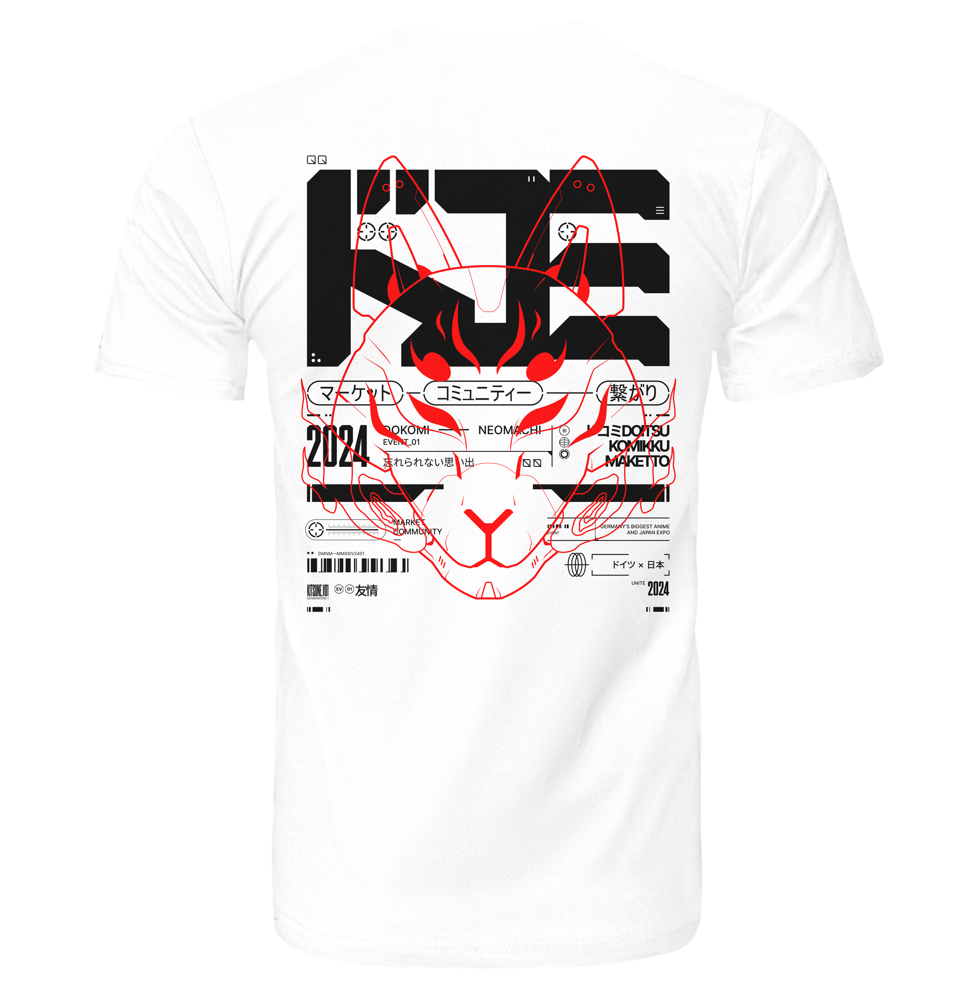 Check out our awesome NeoMachi x DoKomi Cyberpunk T-shirt! We teamed up with DoKomi, Germany's biggest Japan and Anime Expo, to create this unique piece. The hoodie features a bold symbol that combines hiragana characters to spell out "DoKomi." At the center, there's a cool Kitsune design, a mythical fox from Japanese folklore, blending ancient traditions with a futuristic vibe – perfect for that cyberpunk look. The sleeves have extra graphics with red flames and detailed typography, adding to its edgy style.